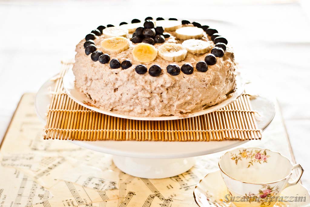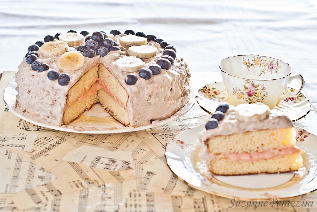 I have made the same base vanilla cake you can find here, which comes from Carol Lovett’s e-book Indulge and then I devised a wonderful banana mousse for the topping and used a few leftovers for the filling between the layers. The banana mousse is made from only 4 ingredients and can be used by itself as a dessert. For the filling, I whizzed together in my trusty mini food processor the lemon curd left over from my lemon meringue tarts, and the leftover coconut topping and strawberry puree from the banana coconut loaf and it made an interesting tart pink mixture which contrasts beautifully with the sweetness of the bananas.
