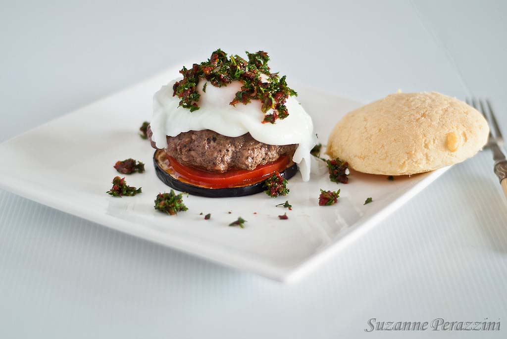 In the photo you can see a great food stack we had for dinner. Layers of eggplant, tomato, beef burger, poached egg and a sprinkling of parsley and sundried tomatoes. But anyone can make that or a version of it. What I am going to tell you about is that lonely little bread roll over on the side. As usual the photos were taken fast before the egg cooled down or slid off the stack so I didn’t think to get a shot of the inside of the roll. But I will definitely be making these again because they are grain and nut-free – my first bread since starting this food journey.