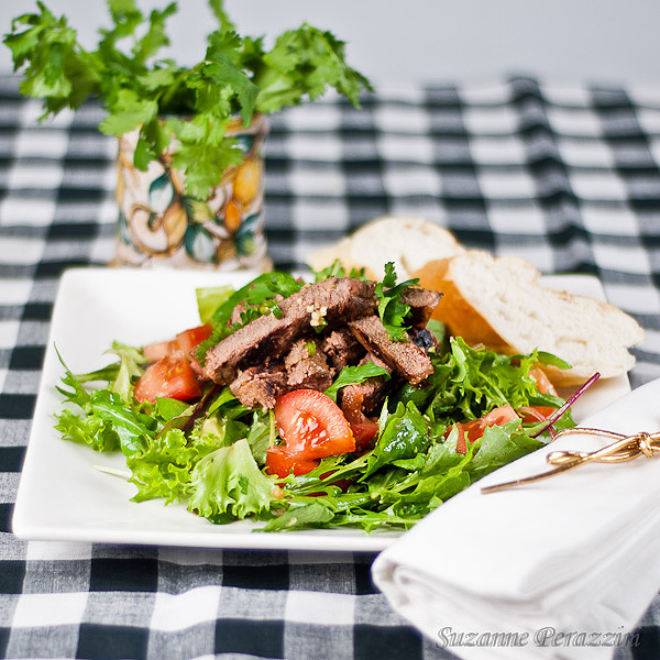 The first thing is to put a couple of sirloin steaks on the grill and cook until still pink inside but not bloody or it will taint the salad.